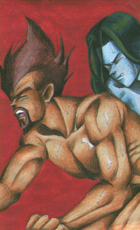 Tears streamed down Zaabon's face, completely disregarded as he plunged into the king's body, his climax building with every stroke. Finally, without realising quite what he was doing, he pulled Vejiita up into his arms, bronzed back against blue chest, and dropped back to kneel upright, both hands pumping the king's erection as the Saiyan's tail wrapped tightly around his waist and his hands clenched in the emerald silk of his partner's hair.
