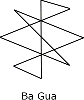 In fact, the ba gua glyph precisely maps onto the Luo Shu glyph when we perform two transformations: a flip around the vertical line of symmetry, and a rotation of 45 degrees anticlockwise.